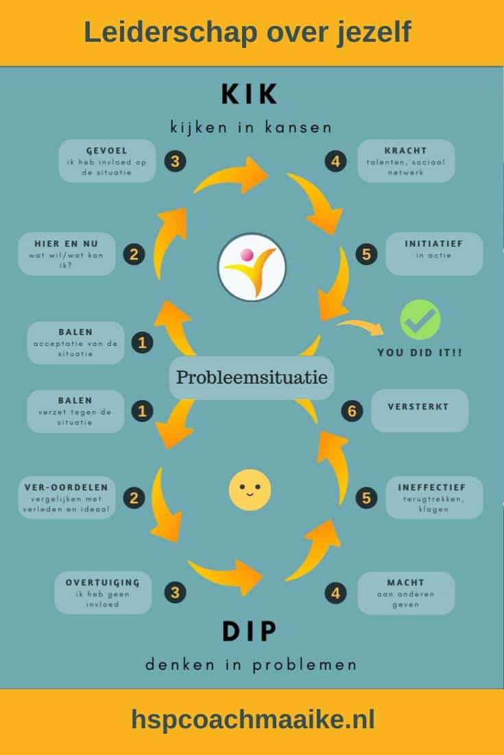 Laten we het model eens nader bekijken. Zoals je ziet heeft het het twee cirkels. De bovenste cirkel gaat over het kijken in mogelijkheden (KIK), de onderste cirkel over het denken in problemen (DIP). In beide cirkels zie je verschillende fases die uiteindelijk leiden tot óf verergering van de situatie of een einde van de situatie.